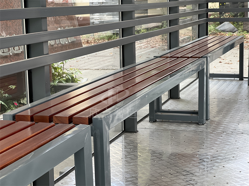 吸煙亭內部配置:滅煙桶、休息椅