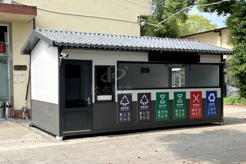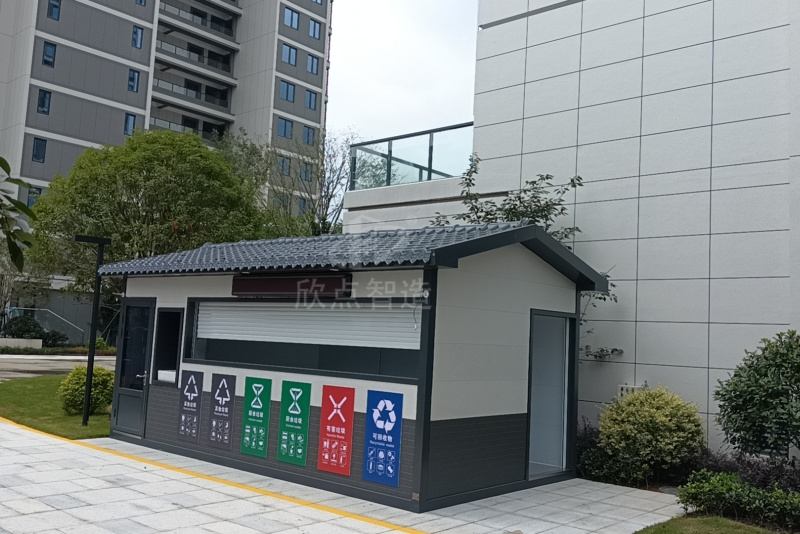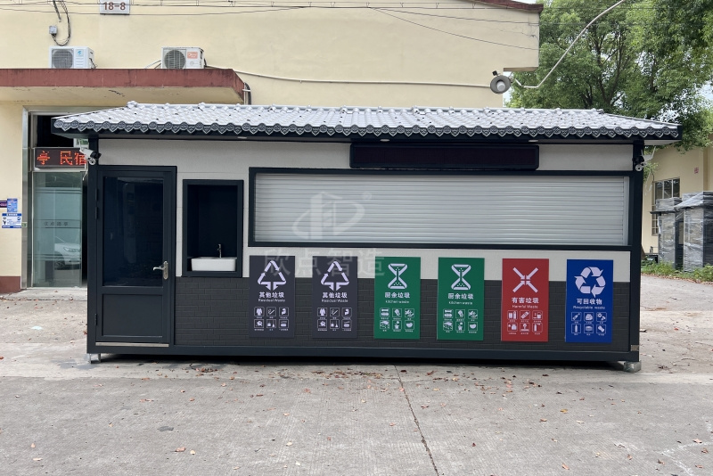 一款發(fā)往臺州市某小區(qū)的四分類垃圾房,尺寸3m×6m×3m。整體鋼架結構,經(jīng)久耐用。外墻采用金屬雕花板材,隔熱保溫。垃圾房科學布局,共設置了可回收垃圾、廚余垃圾、有害垃圾、其他垃圾四分類六個投放口,并配有標識說明。投放口右側配備了洗手臺,便于投放后清洗雙手。獨立的工具房為后期清潔工具的存放和清洗提供了便利。