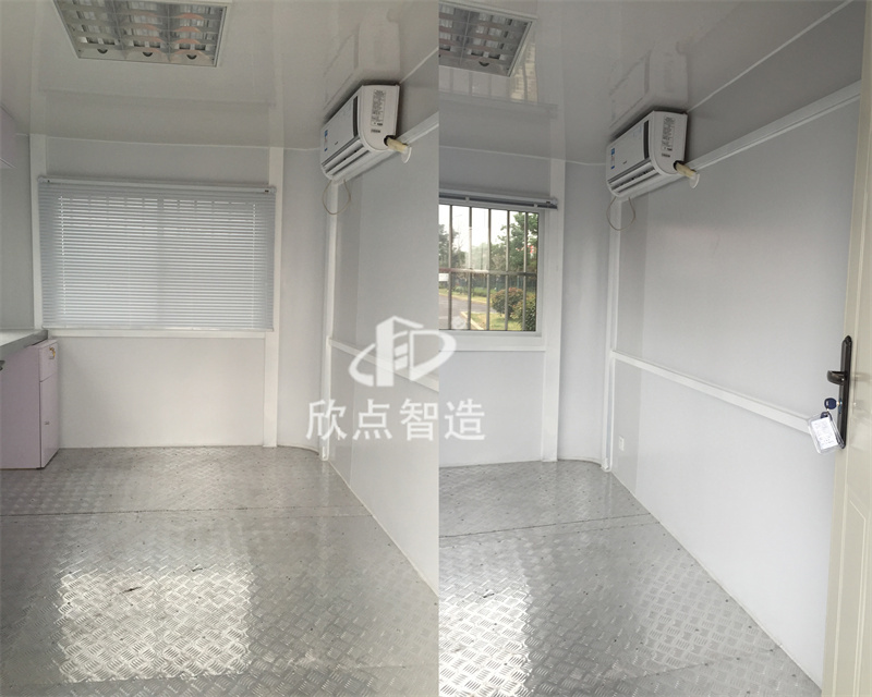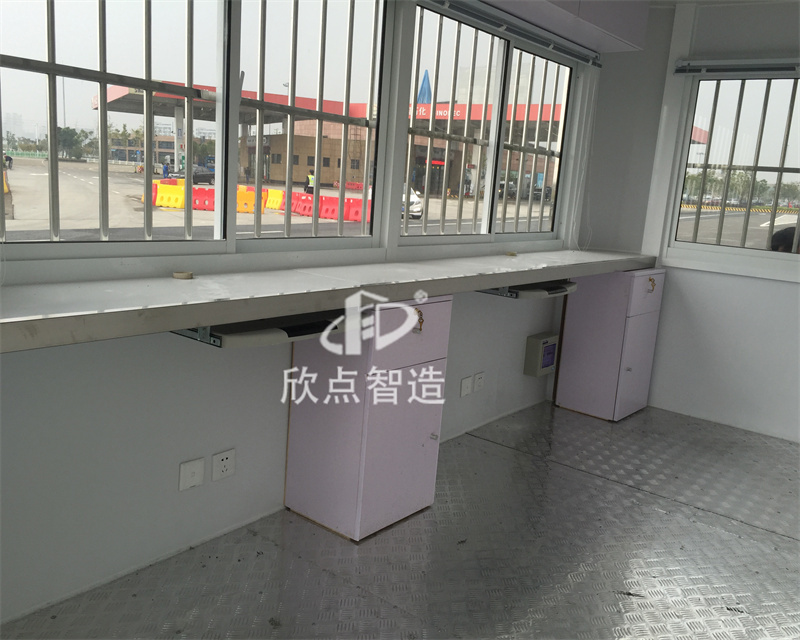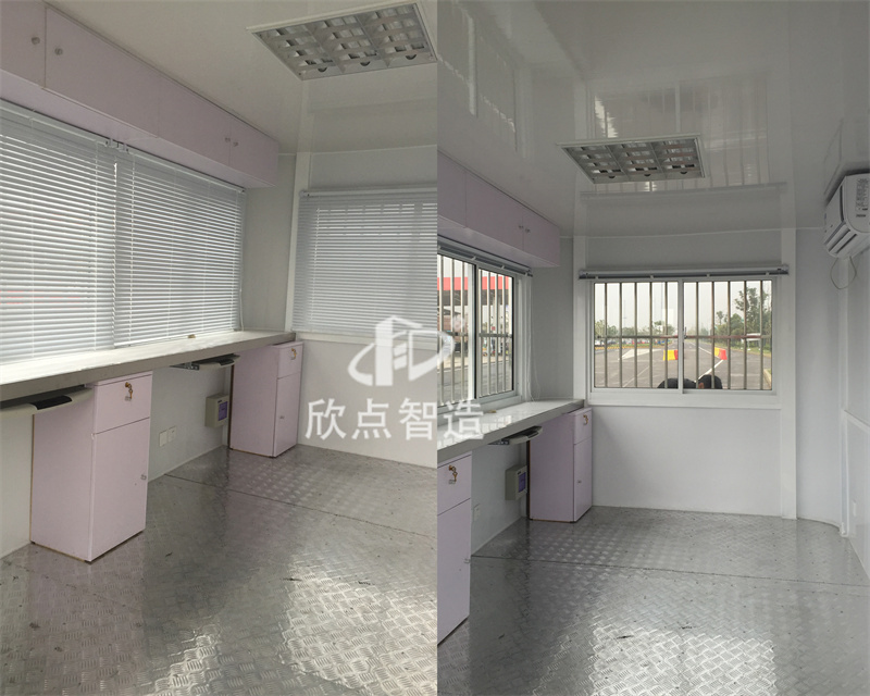 2、治安崗亭配置有:工作臺、插座、配電箱、開關、LED燈等,根據要求還可以加配:監控、空調、辦公椅、文件柜、LED顯示屏、警燈、警用裝備等。使用空間相對寬闊。崗亭內外墻板采用金屬環保板材,無毒無異味。工廠預制生產成品生產送貨上門,真正做到拎包入住。