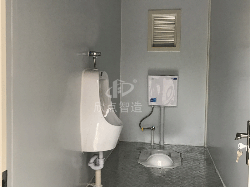 移動廁所內部配置:小便池、蹲坑、304不銹鋼鎖、LED燈、開關、排風扇、配電箱